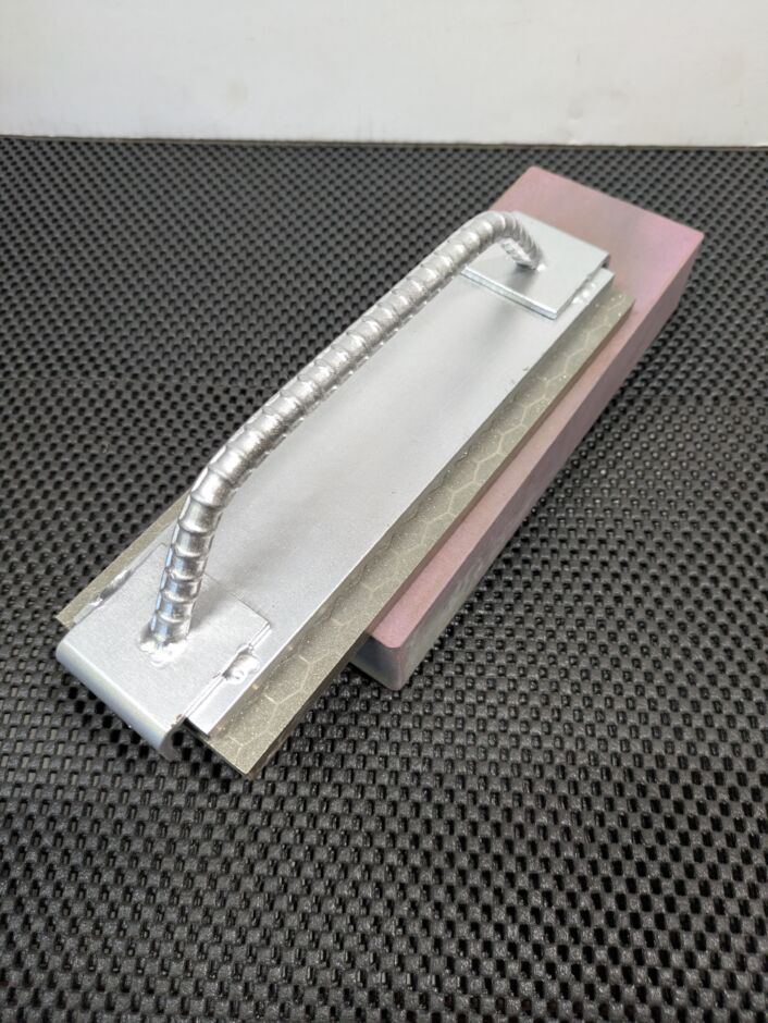 今回、電着ダイヤモンド砥石で砥石の面直しをする時、持ち手があった方がやりやすいので製作しました。最初から持ち手が付いてる物もあるのですが、高額で荒から中まで揃えると結構な金額になってしまいます。でもこのホルダーを使えば、両面の電着ダイヤモンド砥石を2枚揃えれば、荒から中まで面直しが出来ます。うちでは、結構大変な状態の研ぎ直し依頼が来た時、電動工具を使うまでもないけれど、普通の砥石では時間がかかる…そんな時に電着ダイヤモンド砥石を使います。電着ダイヤモンド砥石は研磨力が高いのですが、すぐに研磨力が落ちます。刃物研ぎで使用し、刃がかからなくなってきたら面直し用として使用します。